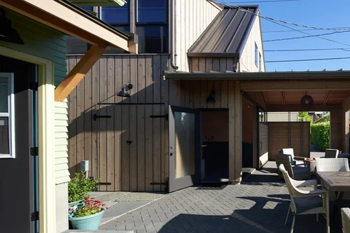 A small accessory structure that provides year round outdoor entertainment. Bold reverse batten cedar siding, custom steel sliding panels and lofty interiors create a robust overflow space in a historic urban neighborhood.
